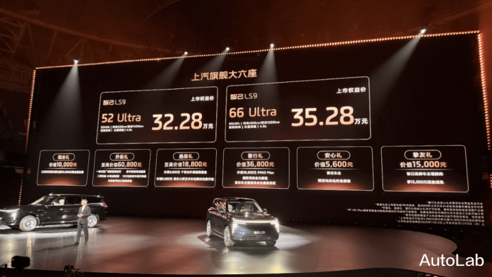 智己LS9分别有“52 Ultra”和“66Ultra”两个SKU,售价分别为32.28万和35.28万元。