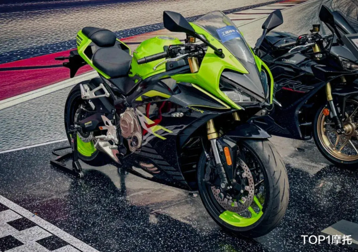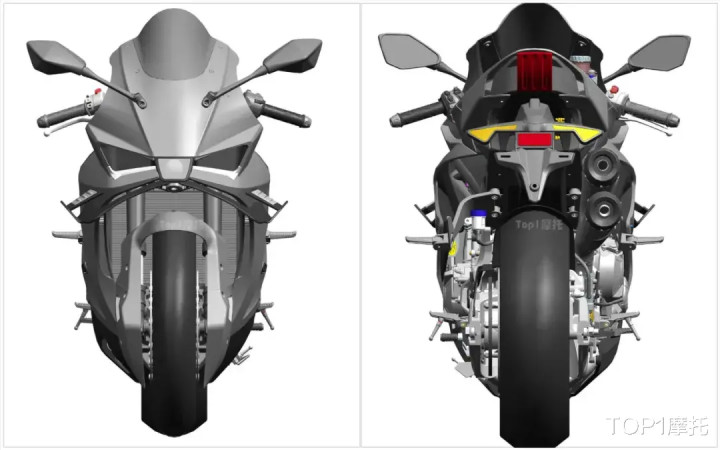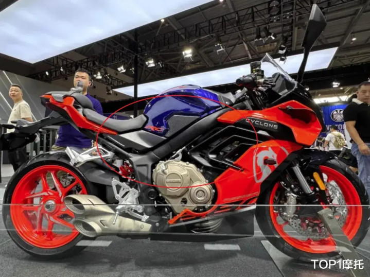 从车身侧面,能够看到大面积的刹车卡钳导流罩,如此大的导流罩还是很少见的。刹车卡钳是前径向四活塞+后双活塞的搭配,减震是倒立式前减震+中置多连杆后减震,。车把的位置比油箱稍微低一点,脚踏的位置比较高,所以这台车的骑行三角应该还是有点战斗的。