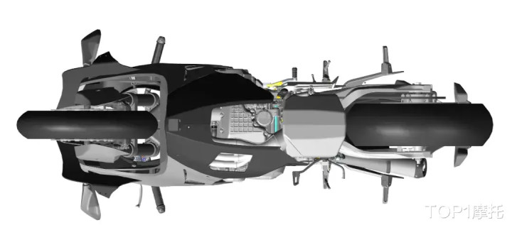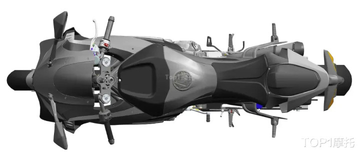 顶部和底部视图也能够看到一些信息,除了能够看到前减震顶端的调节螺丝之外,还能够看到焕然一新的车把按键,以及镂空的上联板和西户的前刹车上泵,风挡的面积比较大,有点竞技风挡的意思,不过从这个角度看不到仪表相关的视角。